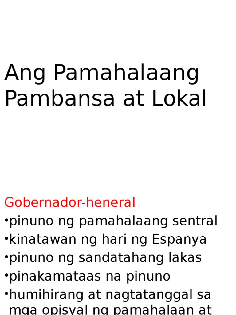 Pinuno galing sa Mexico Ang Pilipinas ay hindi direktang pinamumunuan ng mga Espanyol 9. Tagapagpatupad ng batas para sa bansa. BISE PRESIDENTE PANGALAWANG PANGULO Pumapalit sa Pangulo kapag ito ay nawala.