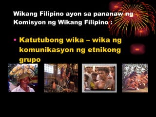 Ang Wikang Pambansa 1 Ano ang tinawag na mga wika ng Filipinas. Quezon - Siya ang nagpatupad ng probisyon ukol sa pambansang wika. Pilipinas hindi Filipinas Pilipino hindi Filipino ayon sa KWF.