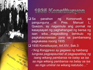 Noong 1934 isang Kombensyong Konstitusyonal ang binuo ng Pamahalaang Komonwelt upang maisakatuparan ang pangarap ni Quezon. Unang-una gaya ng nakasaad sa resolusyon ng Surian ng Wikang Pambansa SWP Tagalog ang tumutugon sa lahat ng pangunahing kailangan ng Batas 184. 1937 Hinirang ni Pangulong Manuel L.