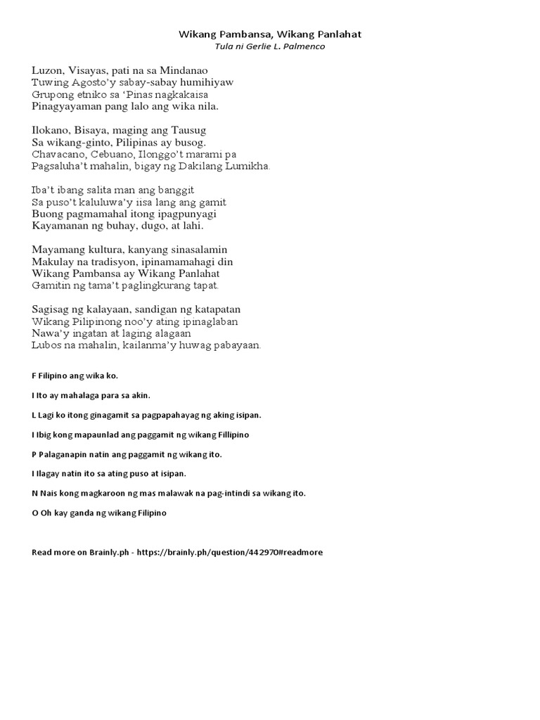 Ng Wikang Pambansa sa bayay ituro Tatlumput dalawang taong sinapuso. Ang wikang pambansa ay mahalaga sa isang nasyon sapagkat ito ang nagbibigay tulay sa mga tao na makipagusap usap na walang hadlang. Ipinagkaloob sa atin ng Ama Ay mga wikain na magkakaiba Kung kaya nga tayo noong dakong una Sa isip at pusoy hindi magkaisa.